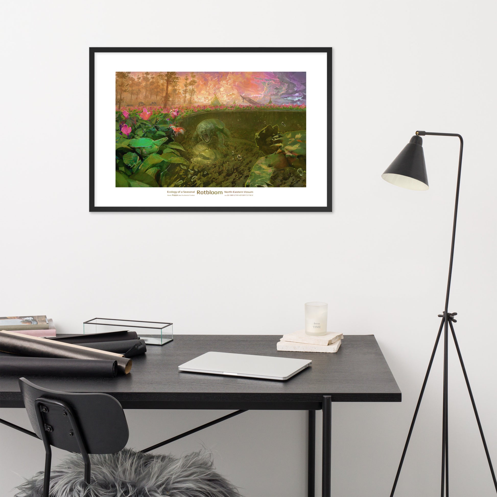 This framed print captures the eerie beauty of the Rotblooms on the Planet of Kappa. Vast mats of strangling water hyacinth set off a cycle of decay and suffocation that chokes and poisons the water-column, suffocating and wiping out water breathing animals in mass die-offs. This creates a banquet of dead flesh for animals like the Glorm. It has just brought down another scavenger, a Blundrith, and defends its kill from a transient Ossipteroth. Meanwhile, massive herbivores, like the Chulnogroth, graze on this endless buffet of fast growing plant matter. With enough feeding, they will clear out this section of the river, and give smaller herbivores, like the Urfa, a chance to feed.